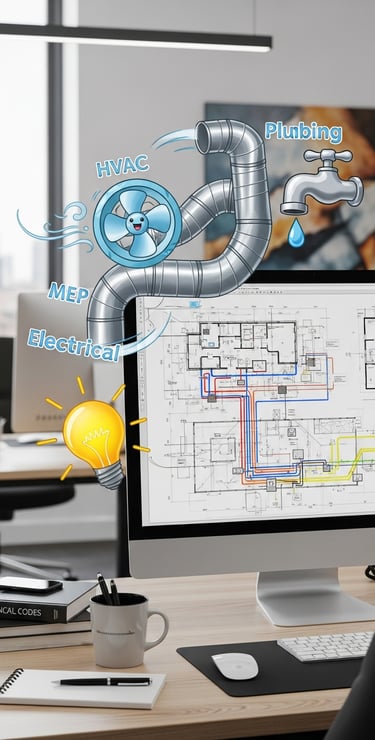 نقدّم تصميم متكامل لأنظمة الميكانيكا والكهرباء والسباكة بحيث تكون جميع الأنظمة متناسقة ومرتبطة مع التصميم المعماري والإنشائي للمبنى. كل نظام يتم تصميمه مع مراعاة الكودات الدولية والمحلية لضمان الأداء المثالي وكفاءة الطاقة وسهولة الصيانة المستقبلية. فريقنا يضمن أن كل مكون من HVACو التكييف و الأنابيب و التوصيلات الكهربائية وأنظمة الإضاءة يعمل بتناغم مع باقي الأنظمة لضمان تنفيذ سلس ومتقن للمشروع.